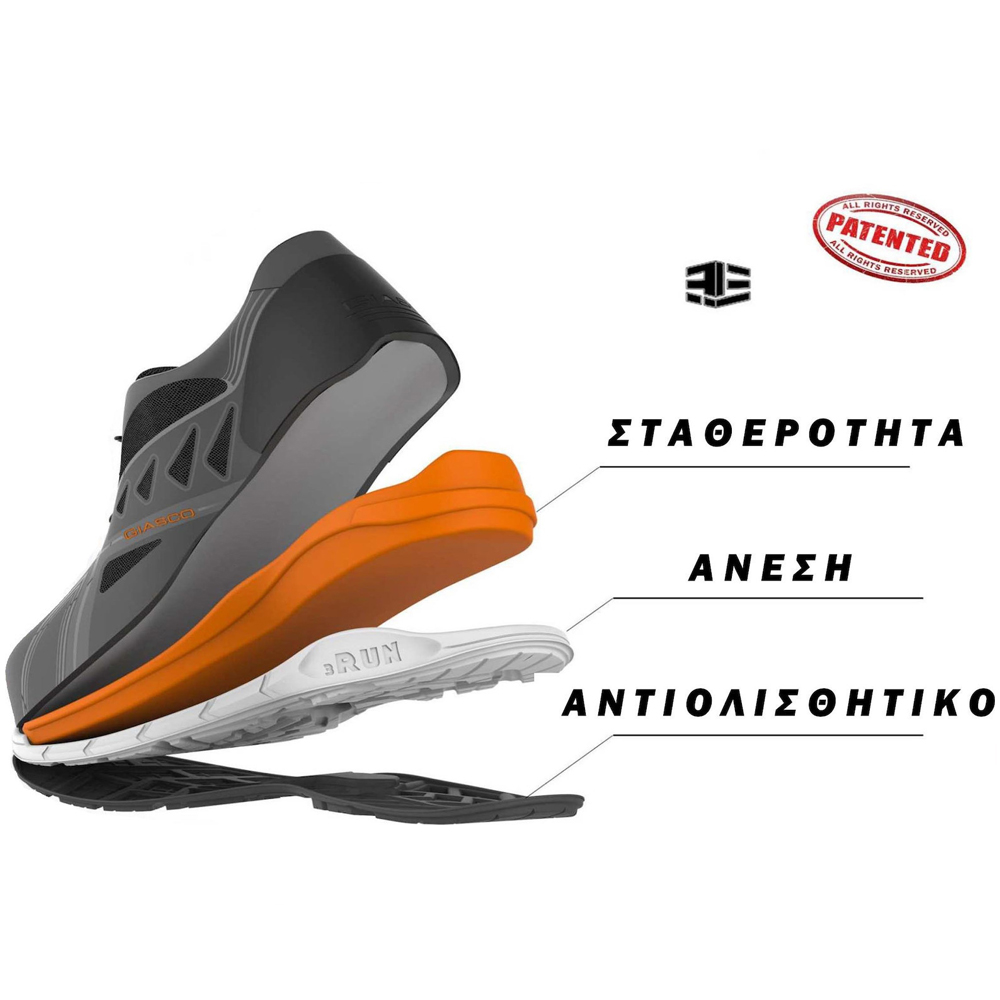 - Εσωτερικός Πάτος Memory: Αποσπώμενος, απορροφητικός, με αντιστατικές ιδιότητες και διαπνοή. Ανατομικός σχεδιασμός που ελαχιστοποιεί την τριβή και ειδικό σχήμα στην φτέρνα για επιπλέον απορρόφηση των κραδασμών. Με λειτουργία "μνήμης" του σχήματος του ποδιού.