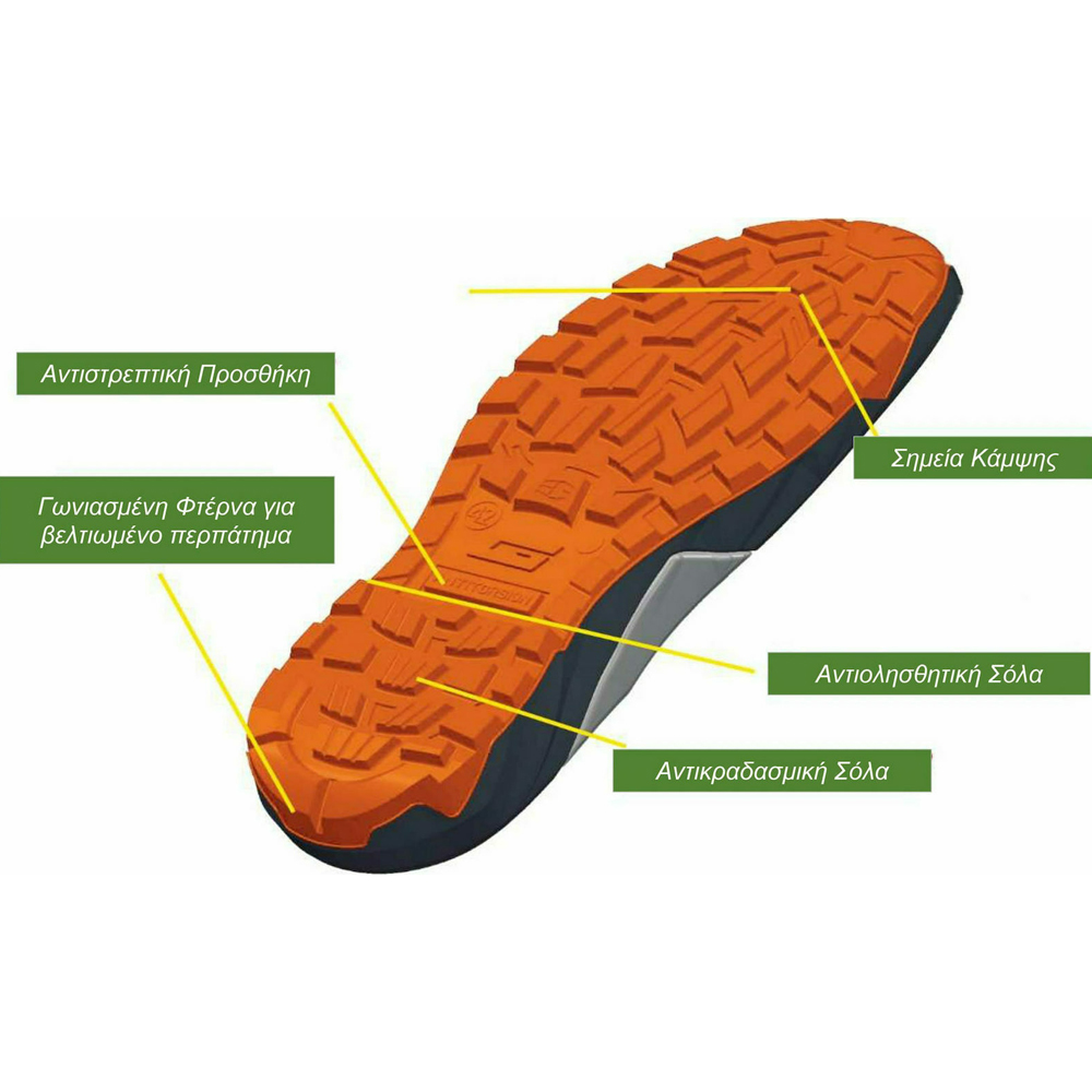 - Ενδιάμεση σόλα, ελαστική, μη θερμική, αντιιδρωτική από συνθετικό ύφασμα ανθεκτικό στην διάτρηση με αντοχή έως 1100N κατά EN 12568 και αντοχή στην κάμψη έως 1.000.000 flexions.